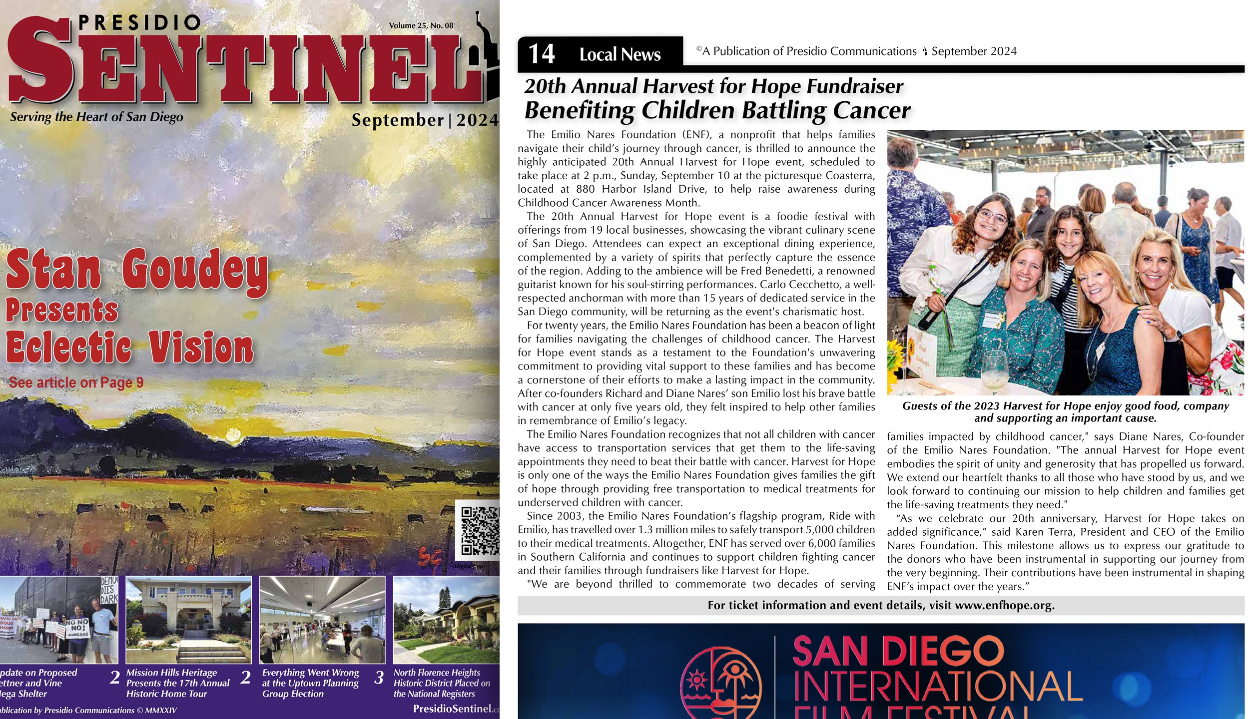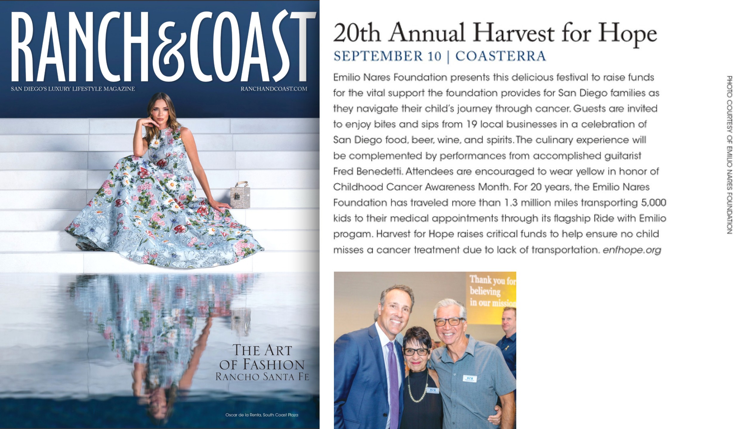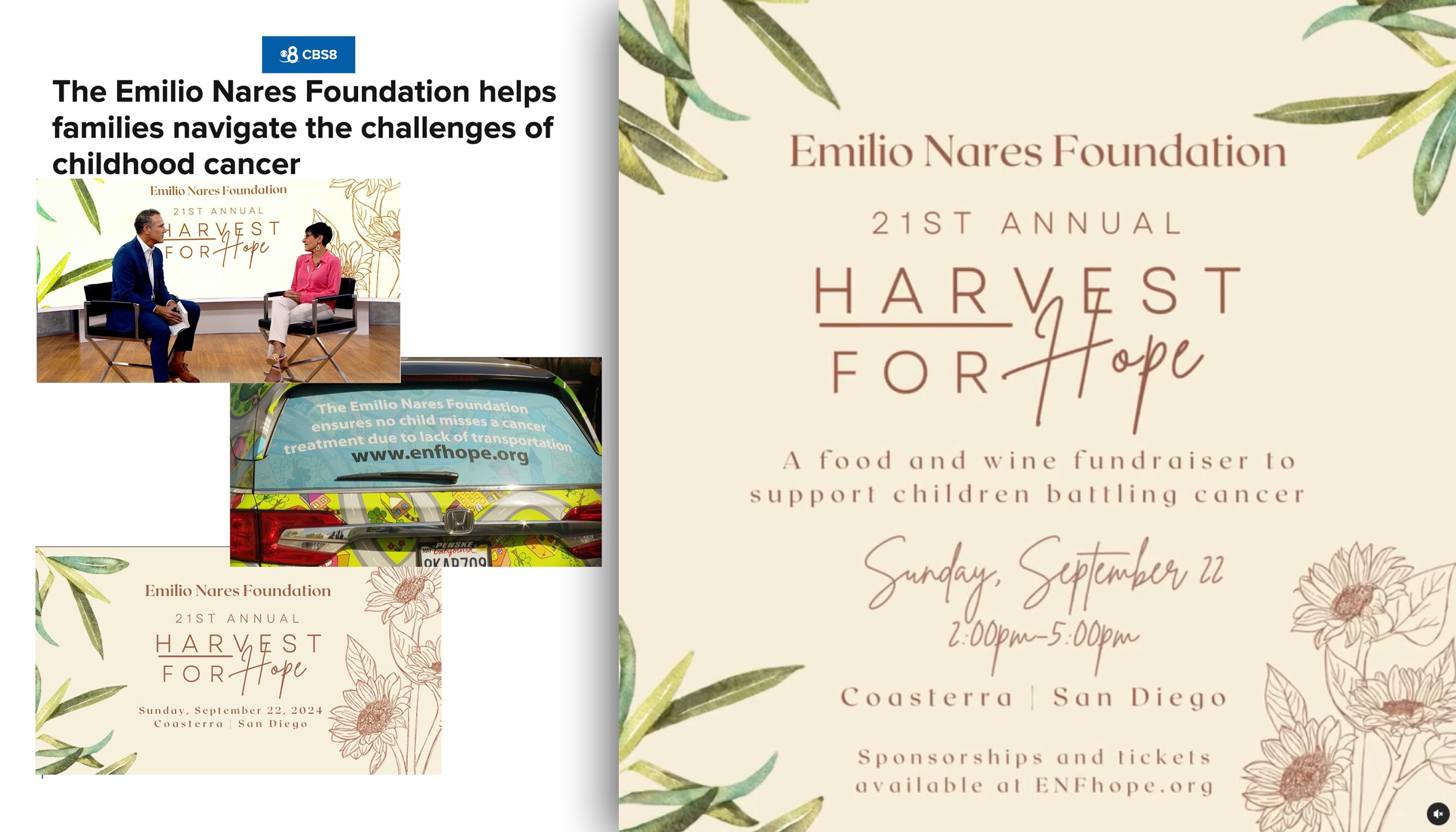 Year after year, Olive consistently surpassed expectations, delivering PR campaigns that effectively built awareness for the Emilio Nares Foundation and elevated the visibility of the Harvest for Hope fundraiser. The campaign’s success is reflected in over 300 media hits throughout the years, including outlets such as Modern Luxury, Presidio Sentinel, Point Loma OB Monthly, San Diego Union-Tribune, Thrillist, San Diego Magazine, Ranch & Coast, Rancho Sante Fe Review, Encinitas Advocate, Del Mar Times and many others. Harvest for Hope has also garnered significant coverage on San Diego’s major TV news affiliates including CBS 8, NBC 7, FOX 5 and KUSI, as well as features on Spanish-language networks such as Univision and KSDY 50, further expanding the event’s reach to the Latine community of San Diego.